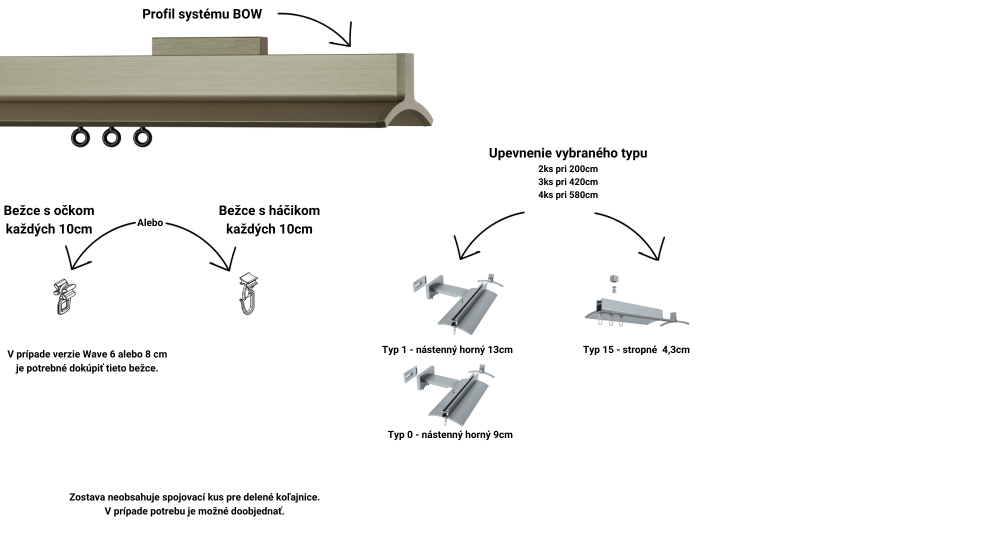 Hliníkové koľajnice lakované práškovou farbou alebo eloxované (podľa farby), vyrábané v jednom kuse až do dĺžky 5,8 m, s možnosťou ohýbania,