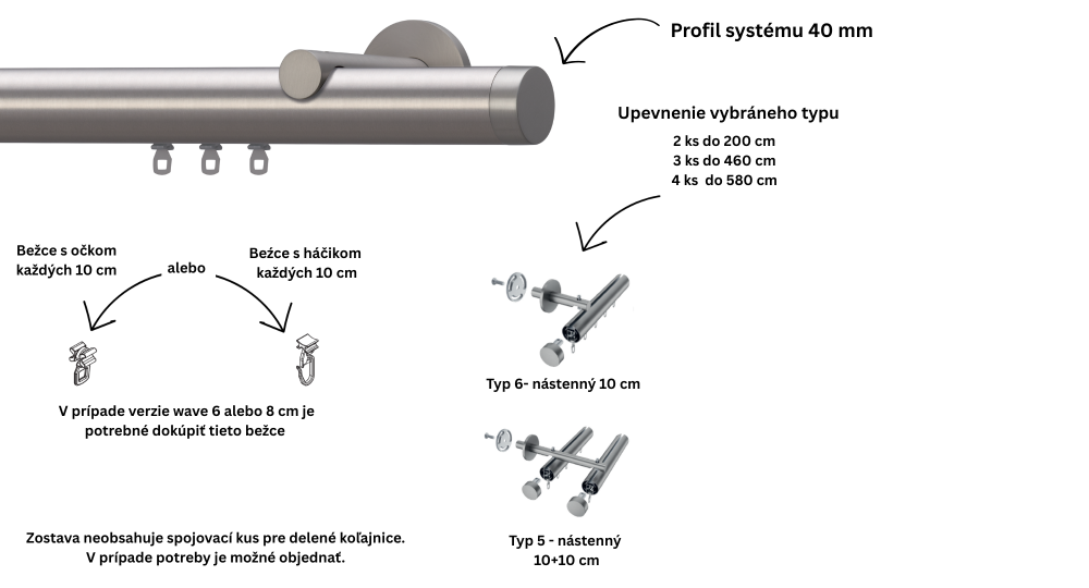 Hliníkové koľajnice lakované práškovou farbou alebo eloxované (podľa farby), vyrábané v jednom kuse až do dĺžky 5,8 m, s možnosťou ohýbania,